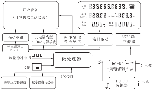 7、按流量頻率信號,可將儀表系數分八段自動進行線性修正,可根據用戶需要提高儀表的計量精度。 •釆用LCD顯示,清晰直觀,讀數方便。