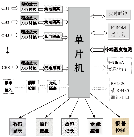 每路輸入信號經程控放大,24位分辨率A/D轉換,光電隔離送至單片機處理。從而徹底消除了各輸入通道之間的干擾,消除了輸入通道與CPU之間的干擾。使用高精度數字溫度傳感器,進行熱電偶的冷端溫度補償。為了提高長期穩定性,本記錄儀放棄了傳統的用電位器調整放大倍數及零點的方法,代之以軟件程序調校法,并實現了放大倍數的程控放大。出廠前廠方對各項參數均已調試完成。用戶可通過鍵盤設定對系統誤差進行平移校正。