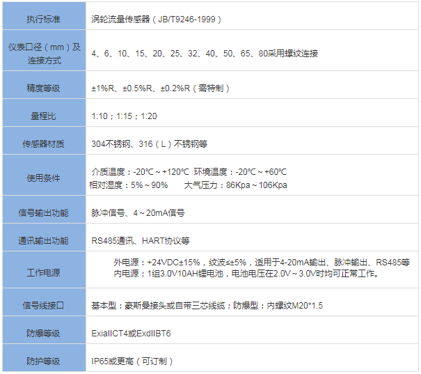 三、小口徑渦輪流量計技術參數