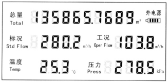2、總量(規范體積)*小保存小數后2位,*大值為99999m3/h,當超出時,示值呈現閃爍, 此時實踐值為示值的10倍。