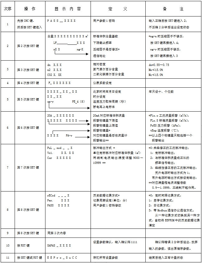 留意事項:(1)參數設置時,只要在*后屏幕呈現EEPro_suCC后進入正常計量狀態才正確存入,否則設置無效。