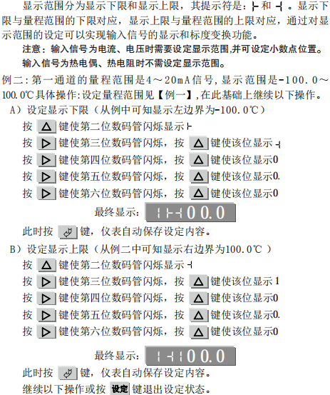 例三:**通道的量程范圍是4~20mA信號,顯現范圍是-100.0~100.0℃ 記載范圍是0.0~150.0℃。