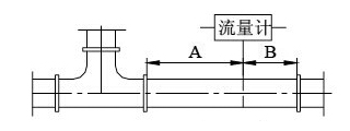 1.流量計(jì)上游有90°彎頭 保證流量計(jì)的前直管段A≥7D,后直管段B≥3D |